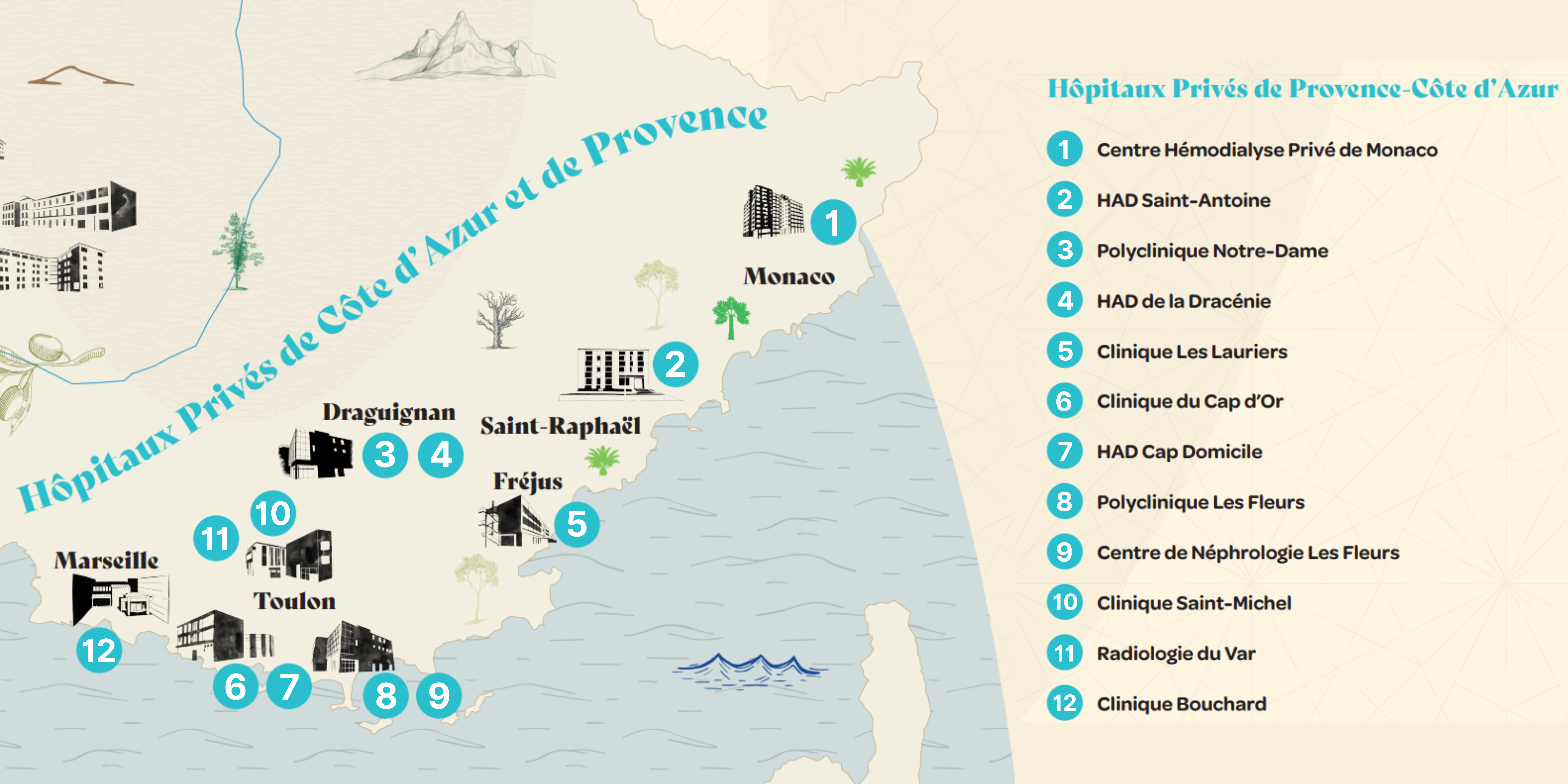 Retrouver sur la carte interactive l’ensemble des établissements ELSAN sur le territoire Provence & Cote-d’Azur.